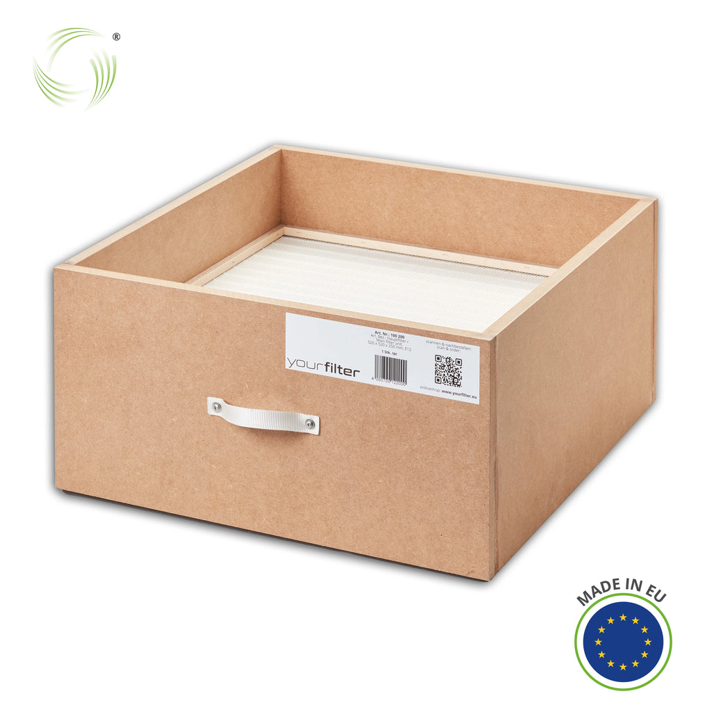 Filtertyp Kompaktfilter MaÃe (L x B x H) 520 x 520 x 250 mm Filterverfahren Einwegfilter Material MDF Rahmen Filtermedium Glasfaservlies Filterfläche 12 m² Filterklasse Filterklasse E12 nach
